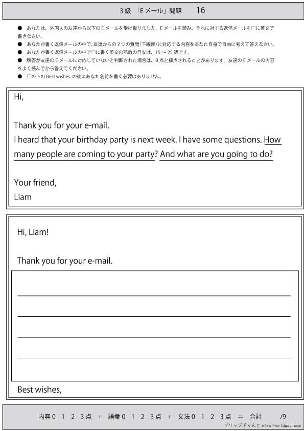 英検3級新ライティング(e-mail問題)オリジナル予想問題全35問
