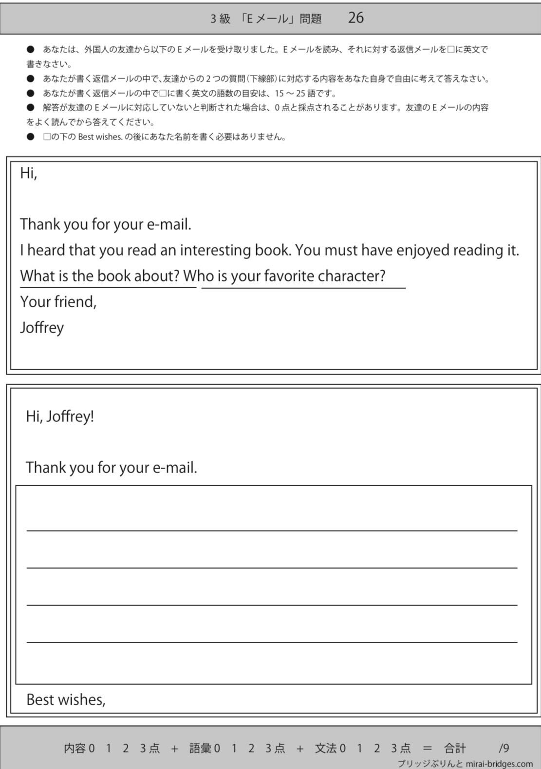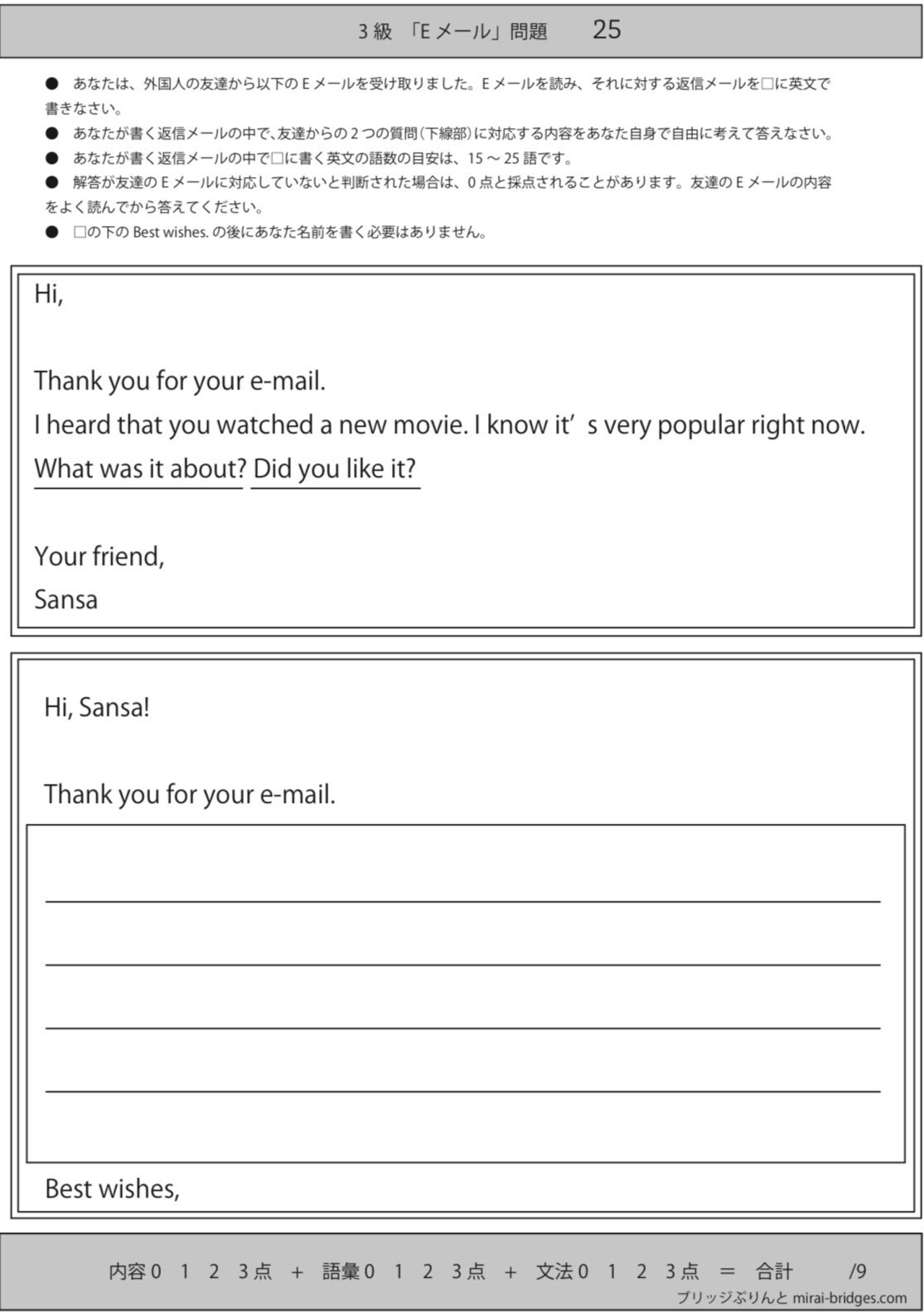 英検3級新ライティング(e-mail問題)オリジナル予想問題パート2 全20問 | miraibridge