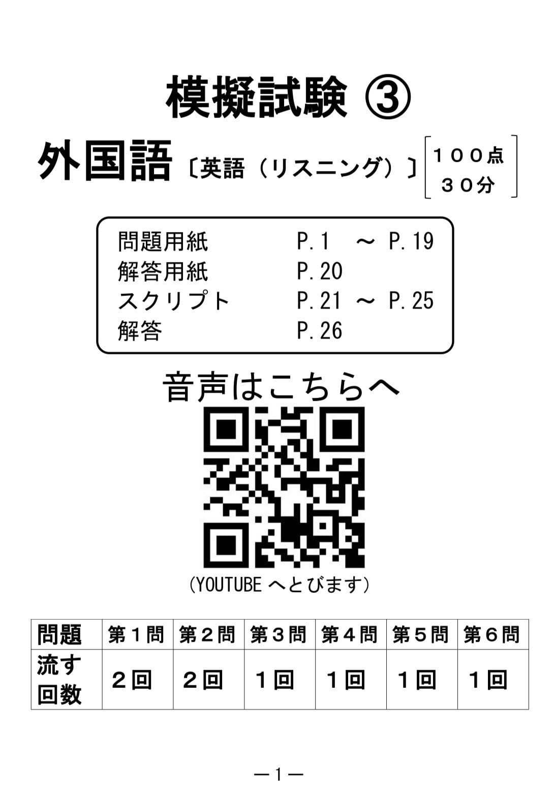 問題用紙と解答用紙を準備したらQRコードからyoutube動画にて模擬試験に挑戦できます。